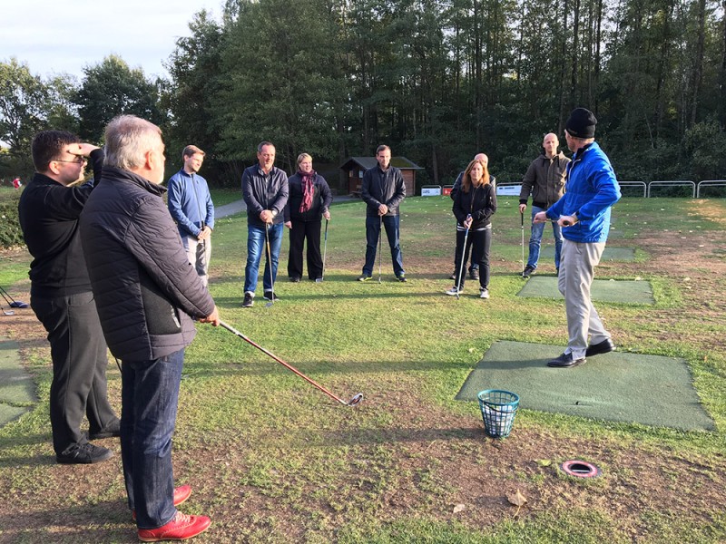 Das Wetter war auf unserer Seite und so wagten sich 11 Teilnehmer, darunter unsere zwei mutigen Frauen Conny und Eva, an die Golfschläger. Was zunächst einfach aussah, gestaltete sich doch schwieriger als gedacht. Aber, wie heißt es so schön - es ist noch kein Tiger Woods vom Hügel gefallen (oder so ähnlich).